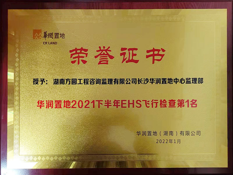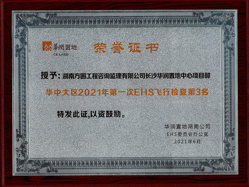 华中大区2021年第一次EHS飞行检查第3名荣誉证书 观看